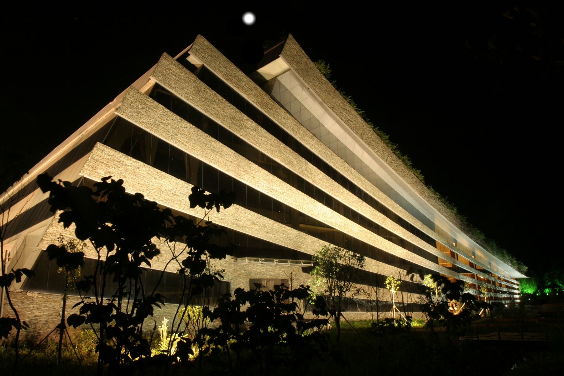 黃龍音樂廳是張家界文化地標(biāo)性建筑,于2010年建成并投入使用。其單體斜坡面屋頂全部為綠茵花草覆蓋,是目前國際上屋頂綠化面積最大的建筑,也是世界公認(rèn)的綠色環(huán)保音樂廳。