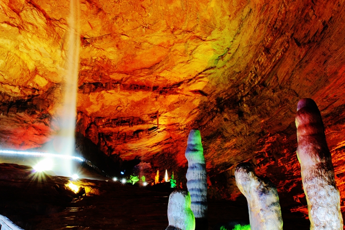黃龍洞因相傳古代洞內(nèi)有黃龍藏身而得名,1983年經(jīng)當(dāng)?shù)?個(gè)青年民兵發(fā)現(xiàn)探明,1984 年正式對(duì)外開放。因洞內(nèi)擁有高闊的洞天、幽深的暗河、懸空的瀑布、上千個(gè)白玉池、數(shù)萬根石筍。